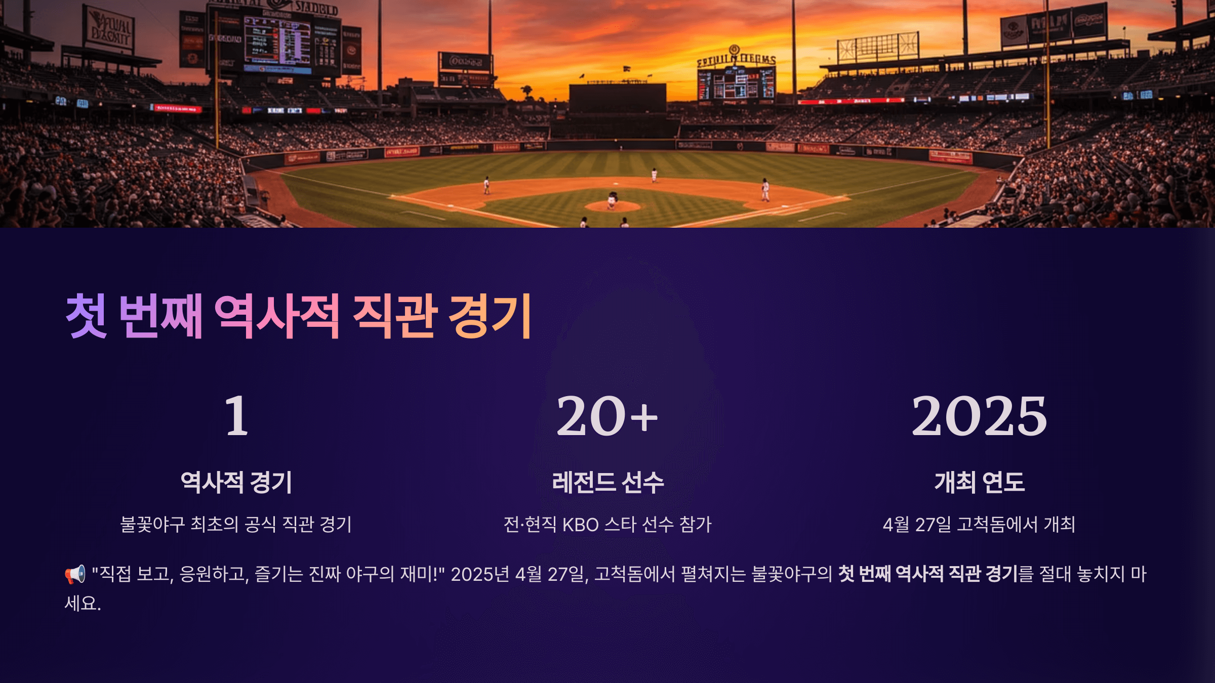 2025년 4월 27일, 고척돔에서 펼쳐지는 불꽃야구의 첫 번째 역사적 직관 경기를 절대 놓치지 마세요.