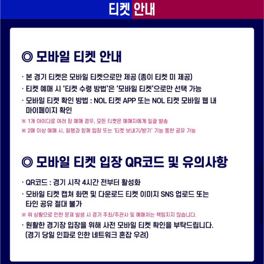 📢경기 예매는 **인터파크 티켓(구 NOL티켓)**에서 진행됩니다. 선예매와 일반 예매 일정이 다르므로 꼭 확인하고 대비하세요.