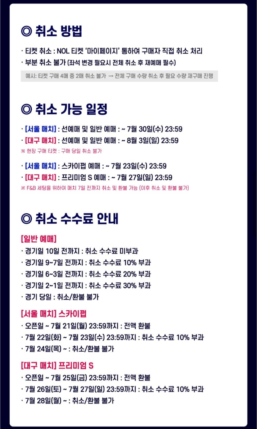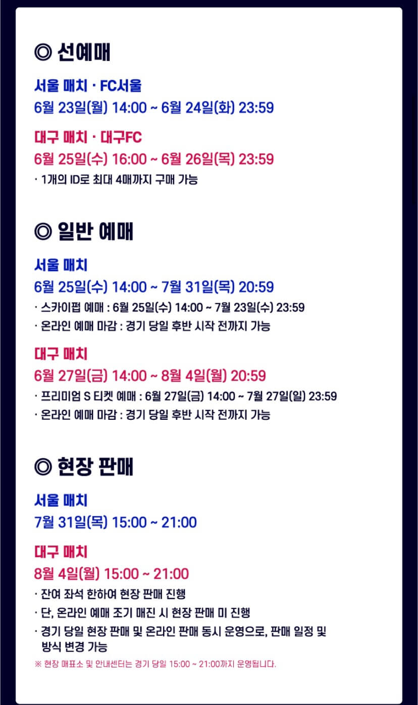 | 대구전 | 6월 25일(화) 오후 2시 | 6월 27일(금) 오후 2시 | 대구FC 시즌권자 우선, 인터파크 티켓 |
