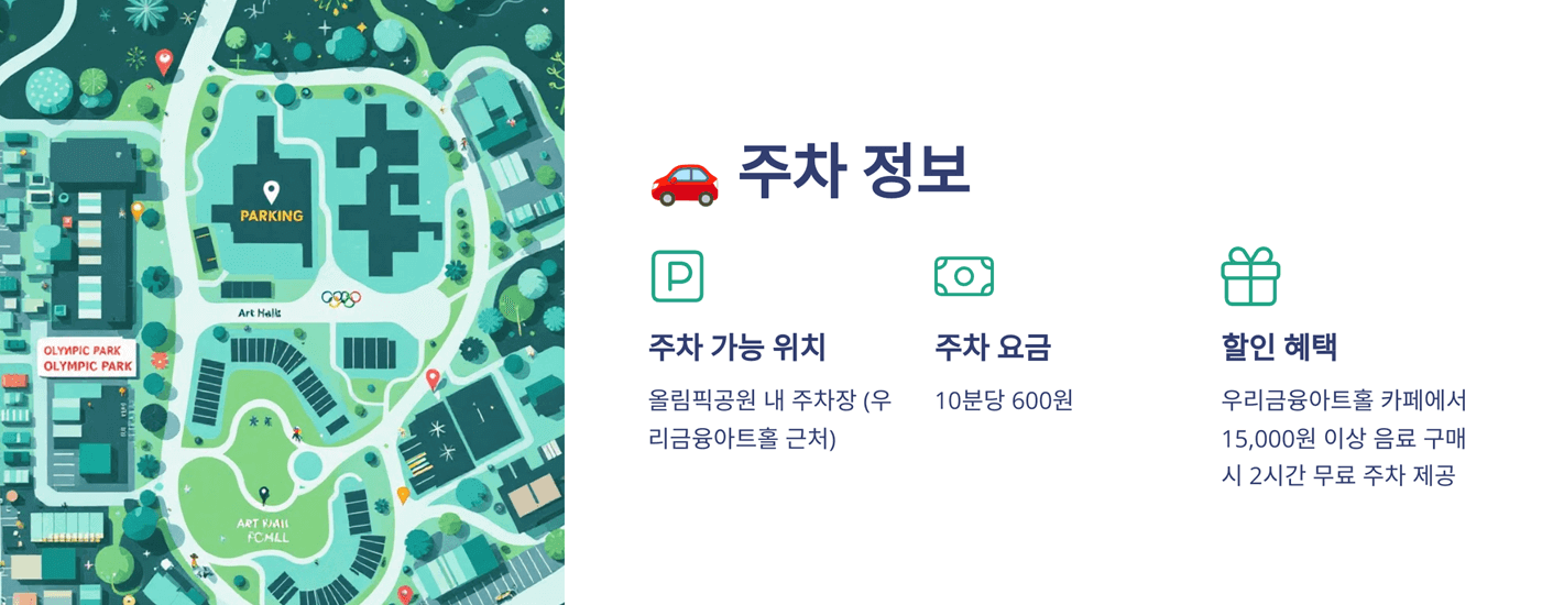 - 우리금융아트홀 카페에서 15,000원 이상 음료 구매 시 → 2시간 무료 주차 제공
